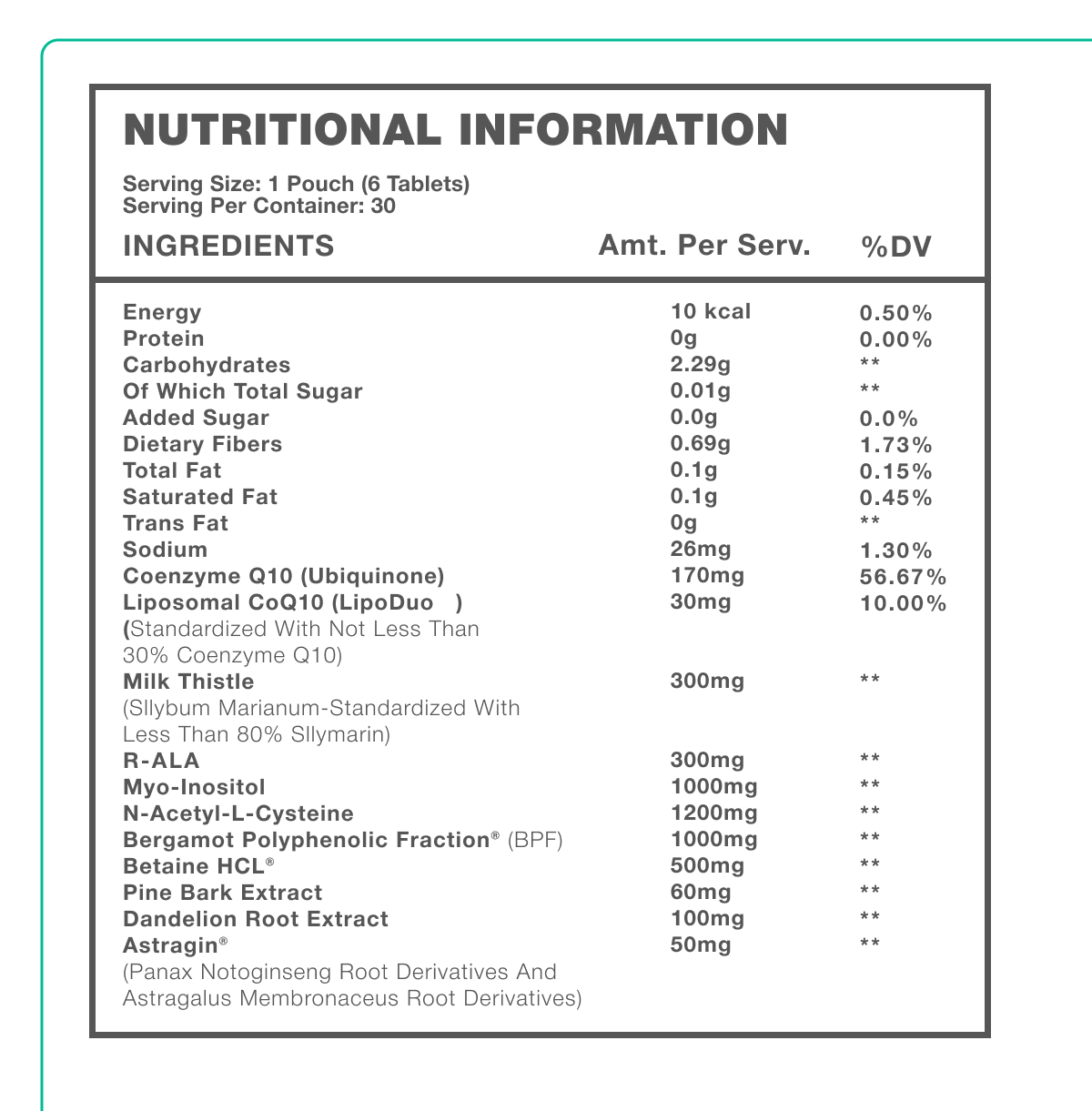 - Liposomal CoQ10 (Encapset®) & Coenzyme Q10 Dual-form CoQ10 ensures both superior absorption and sustained energy. Supports heart health, cellular repair, and endurance.